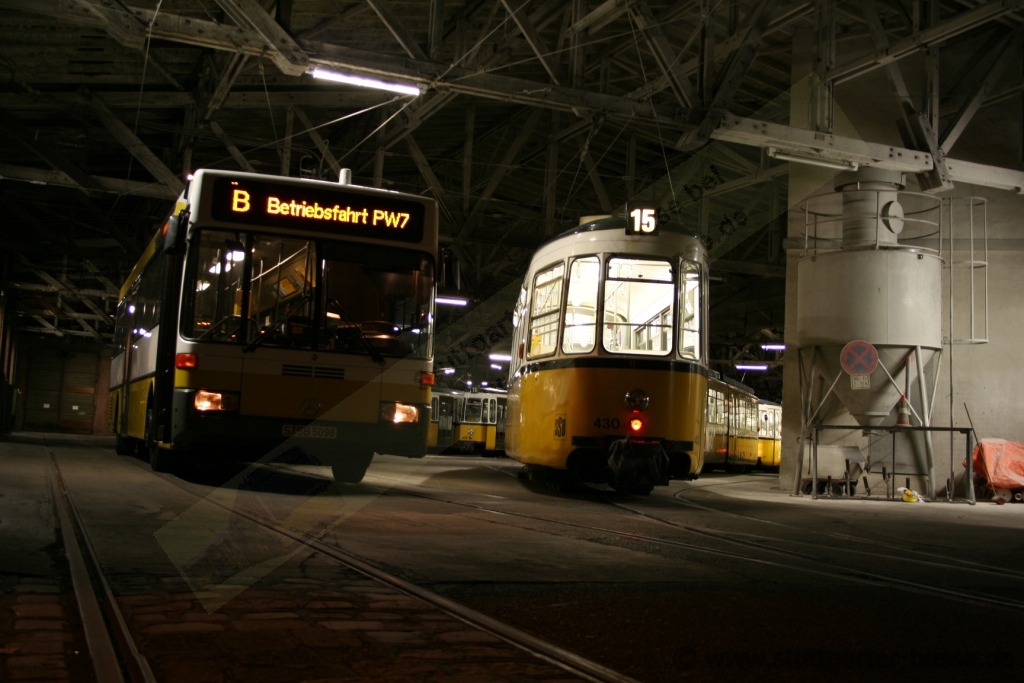 Bald Geschichte: der GT4 und der O 405 im Straßenbahnhof Bad Cannstatt am Morgen des 03. September 2007.