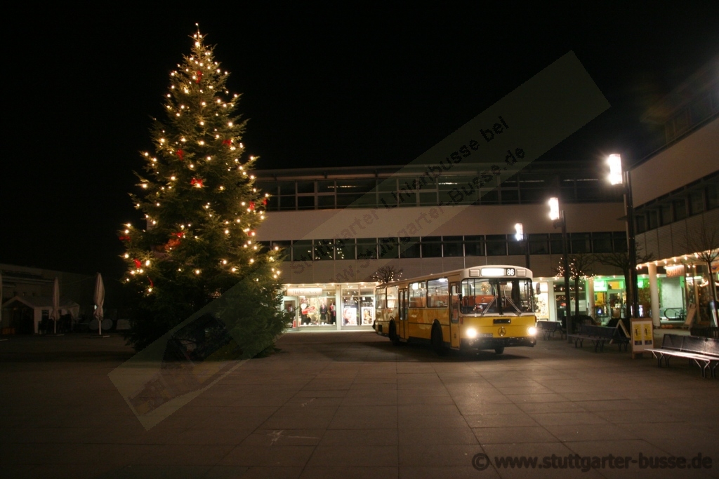 Der historische Omnibus O307 steht hier am 17. Dezember 2007 auf dem weihnachtlich geschmückten Neuen Markt in Leinfelden.