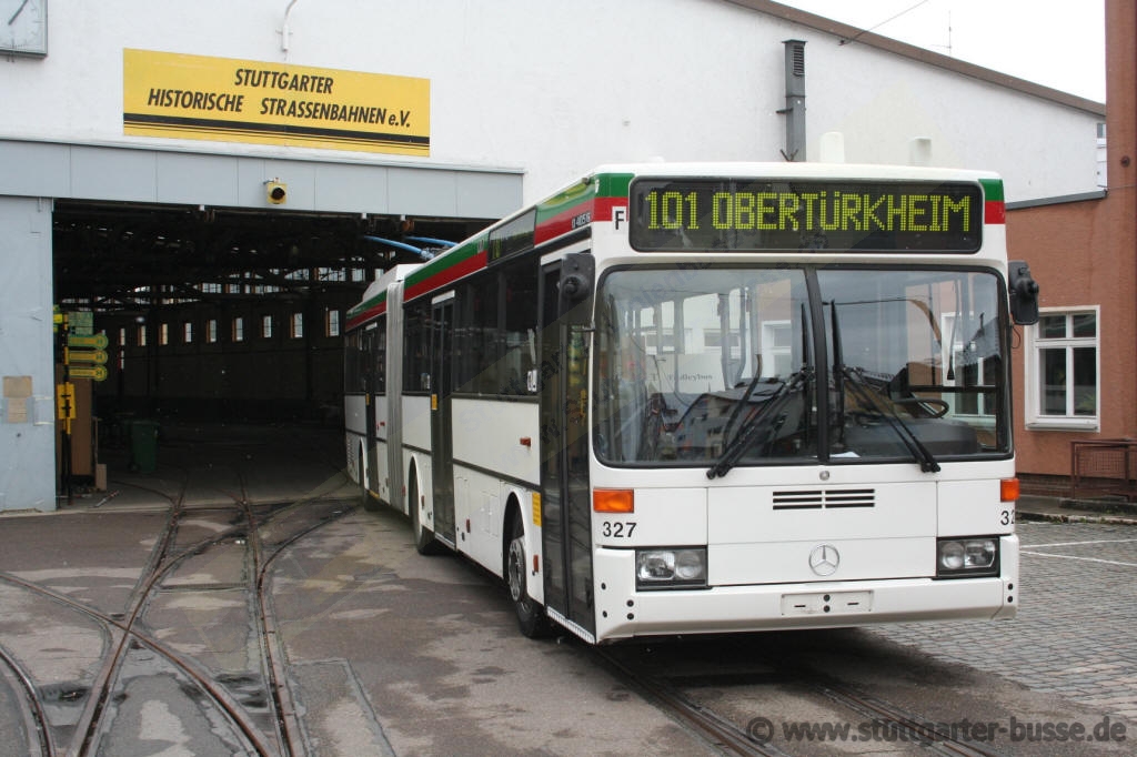 Seit Ende März zählt der Duo-Gelenkbus des Stadtverkehr Esslingen auch zu den Mitgliedern des Straßenbahnmuseums Am 23. März 2008 steht Er hier vor den Hallen des ehemaligen Betriebshofes Zuffenhausen.