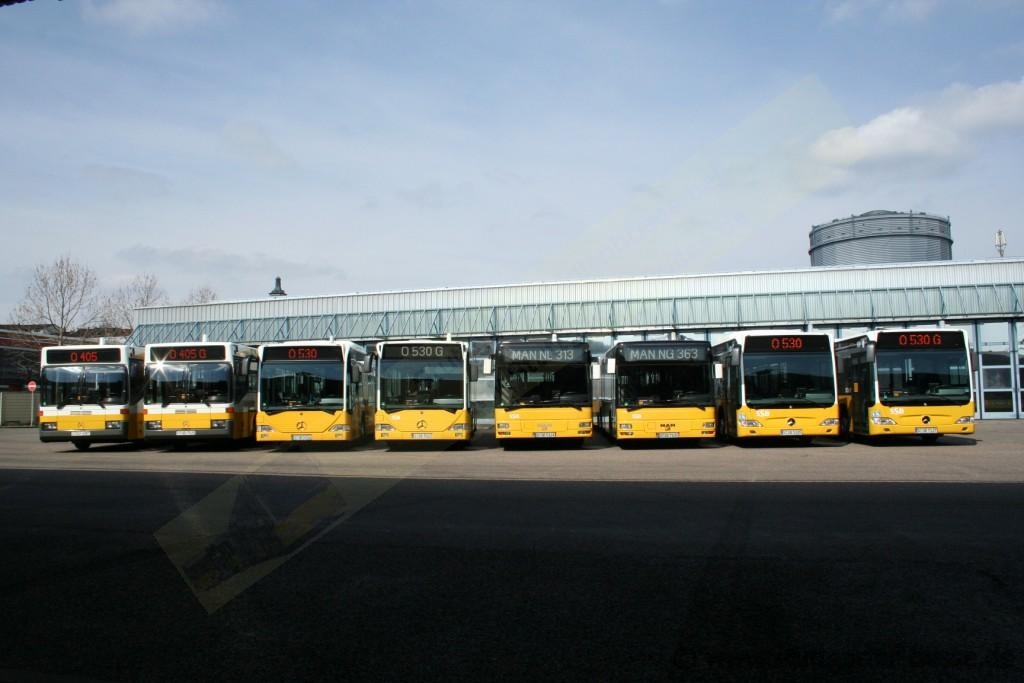 Bei der SSB gibt es derzeitig 8 verschiedene Fahrzeugtypen, hier stehen Sie alle vor dem Werkstattbau im Betriebshof Gaisburg. Am 24. März 2008 versammelten sich von links 5087, 7526, 5154, 7023, 5124, 7105, 5185 und 7137.