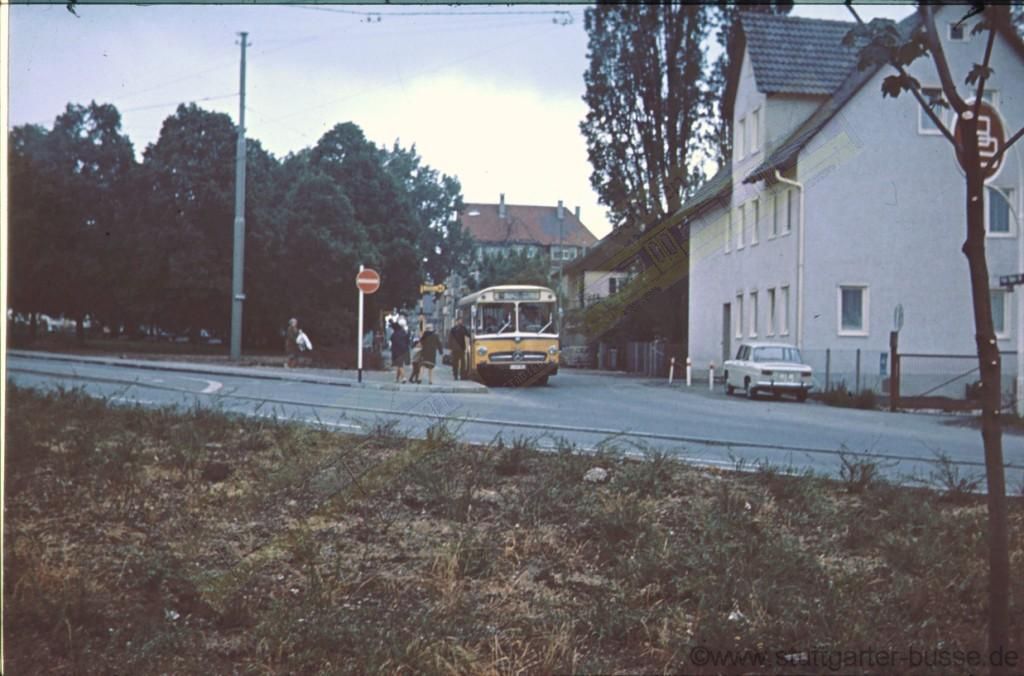 Anfang der 70er Jahre bedient ein Wagen der Linie 70 die Haltestelle Albplatz in der Felix-Dahn-Straße in Degerloch. Heute befindet sich an dieser Stelle der ZOB, auch von der alten Straßenbahnschleife linkerhand ist heute nix mehr zu sehen.