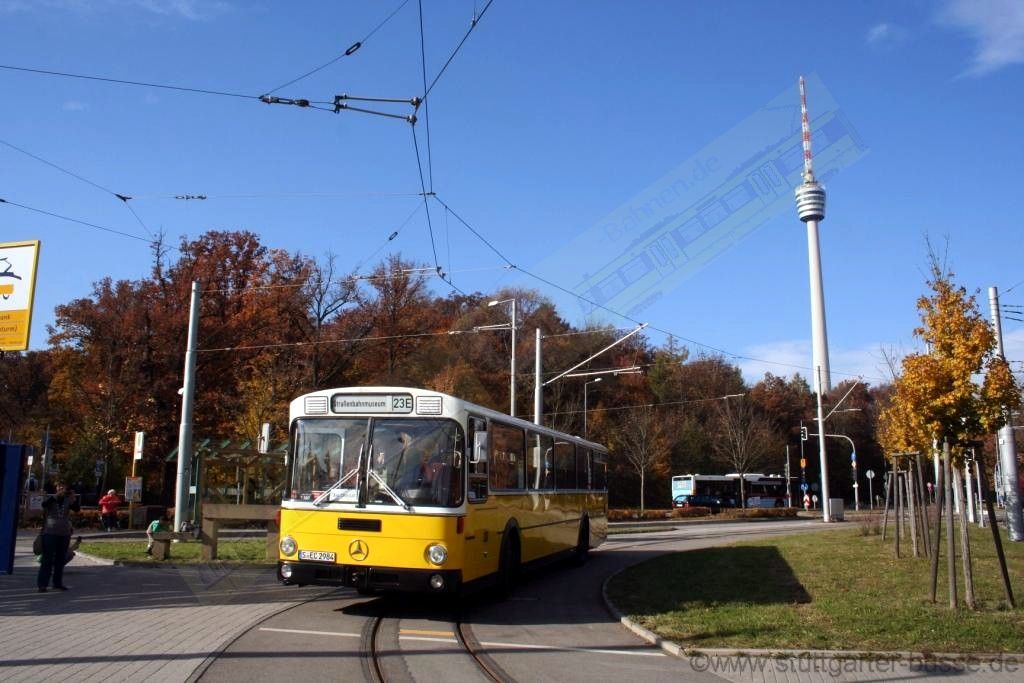 historischen Straßenbahn der Oldtimerbus O307 die Strecke zum Fernsehturm.
